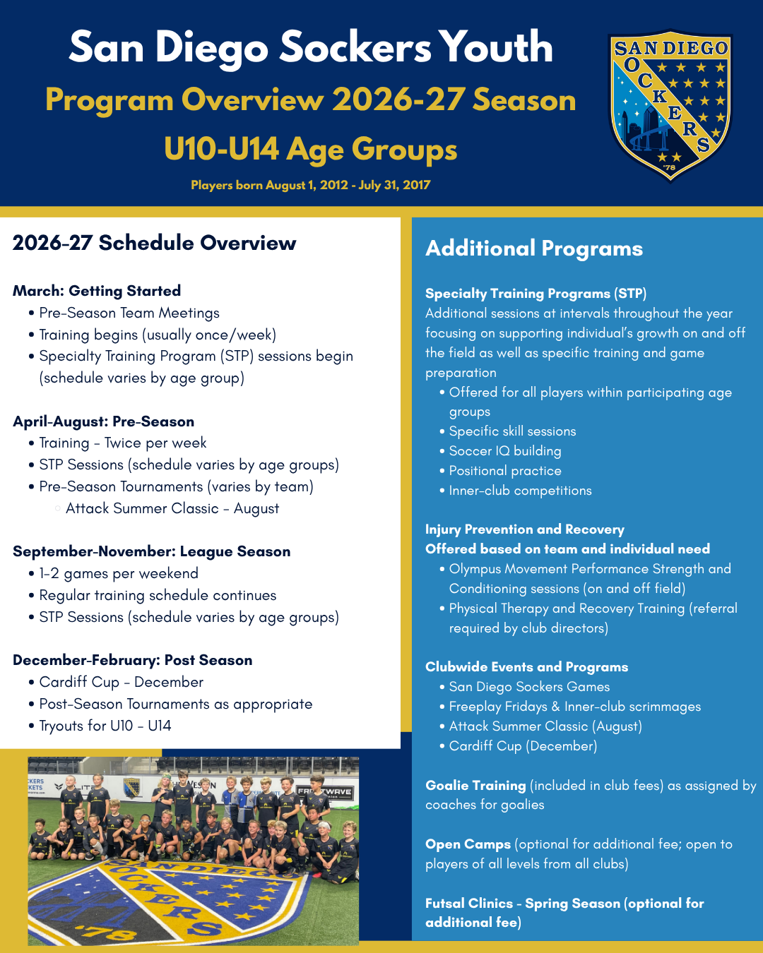 Teams will begin under the new San Diego Sockers umbrella as teams are formed for the 2026-27 season. Current teams in each program (Cardiff Sockers and RSF Attack) will continue through the completion of their current season.